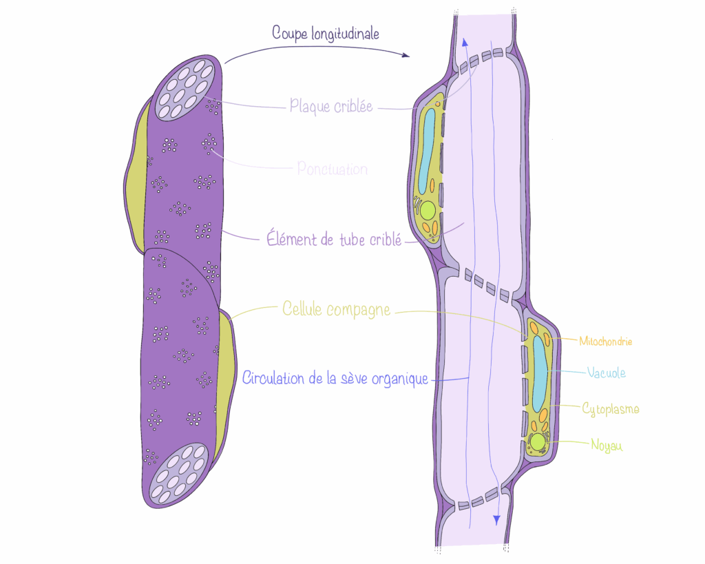 Tissu conducteur de la sève organique (aussi appelé sève phloémienne ou sève élaborée). Il comprend des cellules parenchymateuses, des fibres (dans la tige et les feuilles, pas dans la racine) et des cellules conductrices vivantes à maturité appelé éléments du tubes criblés.