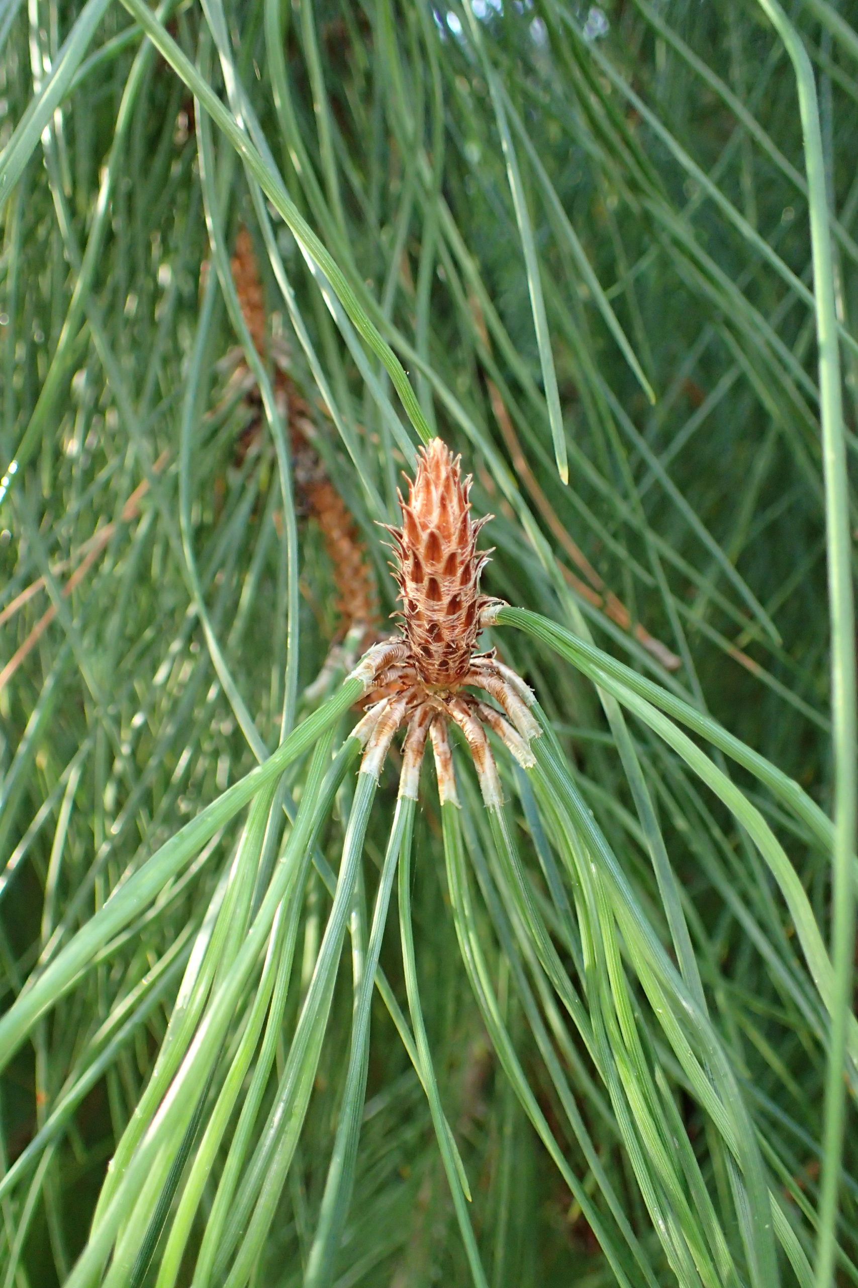 Aiguilles persistantes, groupées par deux, fortes, rigides, falquées mais non vrillées, de 12 à 20 cm, finement dentées, vertes clair
